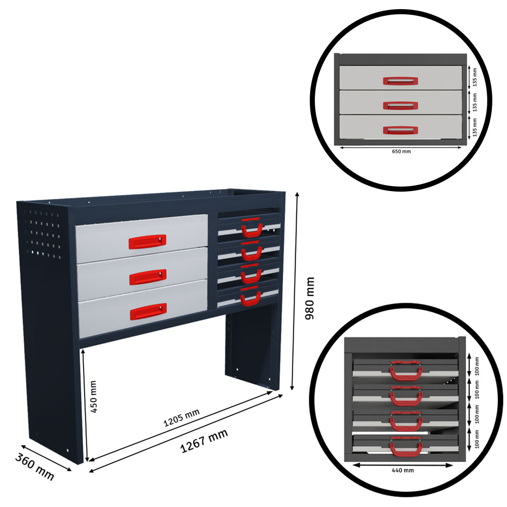 De lades hebben een binnenmaat van 650 mm breed, 325 mm diep en 115 mm hoog. De koffers hebben een grootte van 440 mm breed, 330 mm diep en 66 mm hoog. Met een draagkracht van 50 kg per lade, 15 kg per koffer en 40 kg per plank kun je ruim voldoende materialen meenemen zonder in te leveren op veiligheid of stabiliteit. Je kunt de kastmodule uitbreiden met accessoires die passen bij jouw werkzaamheden.