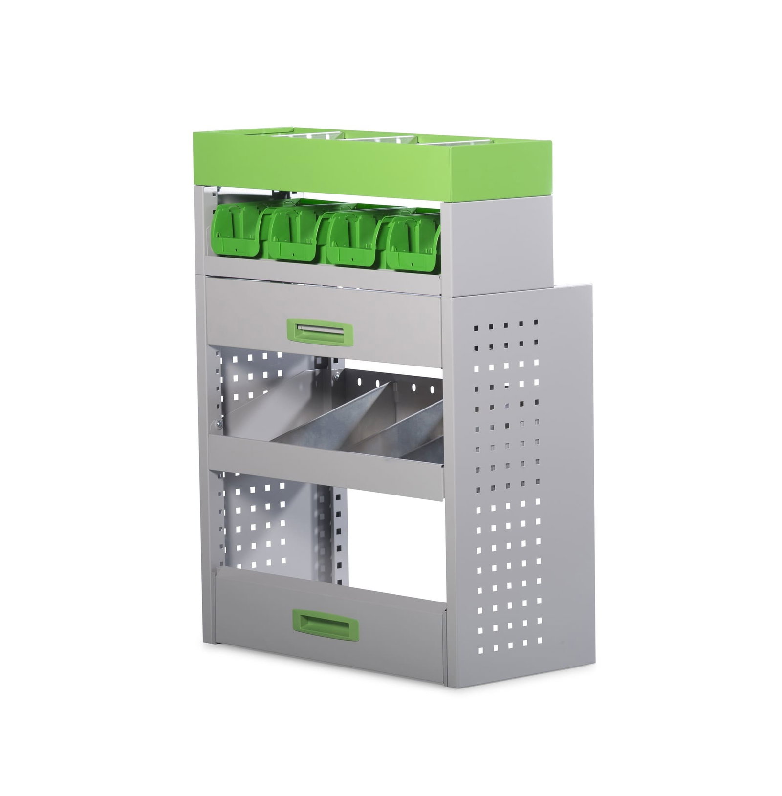 De bedrijfswageninrichting krijg je volledig geassembleerd thuis geleverd inclusief montage gereedschap. Met behulp van de beugels kan je de kast bevestigen aan de vloer en zijwand van jouw voertuig. Wij leggen alles stap voor stap uit in de meegeleverde handleiding.