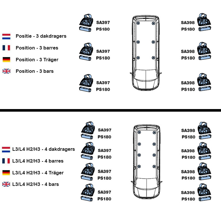 Let op! Het is achteraf niet mogelijk om de set dakdragers uit te breiden, losse dragers zijn niet leverbaar. Daarnaast heeft elke dakdrager zijn eigen positie op het dak. Het is daarom van belang om de dakdragers volgens de instructies te monteren.