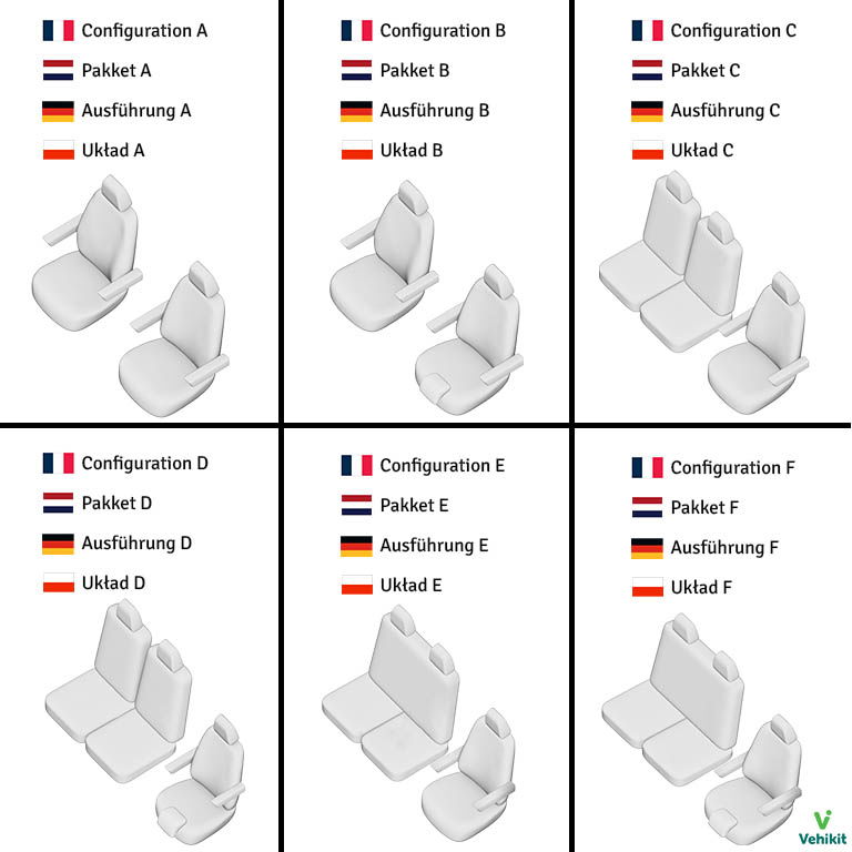 Deze hoezen zijn speciaal ontworpen voor jouw MAN TGE. Ze sluiten perfect aan op de verschillende delen van de stoel of bank en blijven altijd strak zitten. Veiligheid staat voorop, dus deze hoezen zijn volledig compatibel met airbags. Bij een ongeval breken de elastische naden van de hoes gemakkelijk, zodat de airbag zich kan ontvouwen. Of je nu een bank of losse stoelen hebt, onze hoezen garanderen een optimale bescherming. Ontdek de verschillende beschikbare opties in onderstaande tabel, evenals de inhoud van elke set.