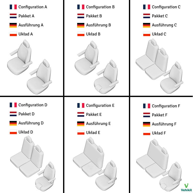 Deze hoezen zijn speciaal ontworpen voor jouw Volkswagen Crafter. Ze sluiten perfect aan op de verschillende delen van de stoel of bank en blijven altijd strak zitten. Veiligheid staat voorop, dus deze hoezen zijn volledig compatibel met airbags. Bij een ongeval breken de elastische naden van de hoes gemakkelijk, zodat de airbag zich kan ontvouwen. Of je nu een bank of losse stoelen hebt, onze hoezen garanderen een optimale bescherming. Ontdek de verschillende beschikbare opties in onderstaande tabel, evenals de inhoud van elke set.