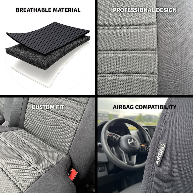 Pokrowce zostały zaprojektowane tak, by idealnie leżeć na fotelach przednich — zarówno w wersji z dwoma oddzielnymi siedzeniami, jak i z kanapą. Specjalne szwy są przystosowane do działania poduszek powietrznych – w razie potrzeby łatwo się rozrywają, nie blokując ich działania.