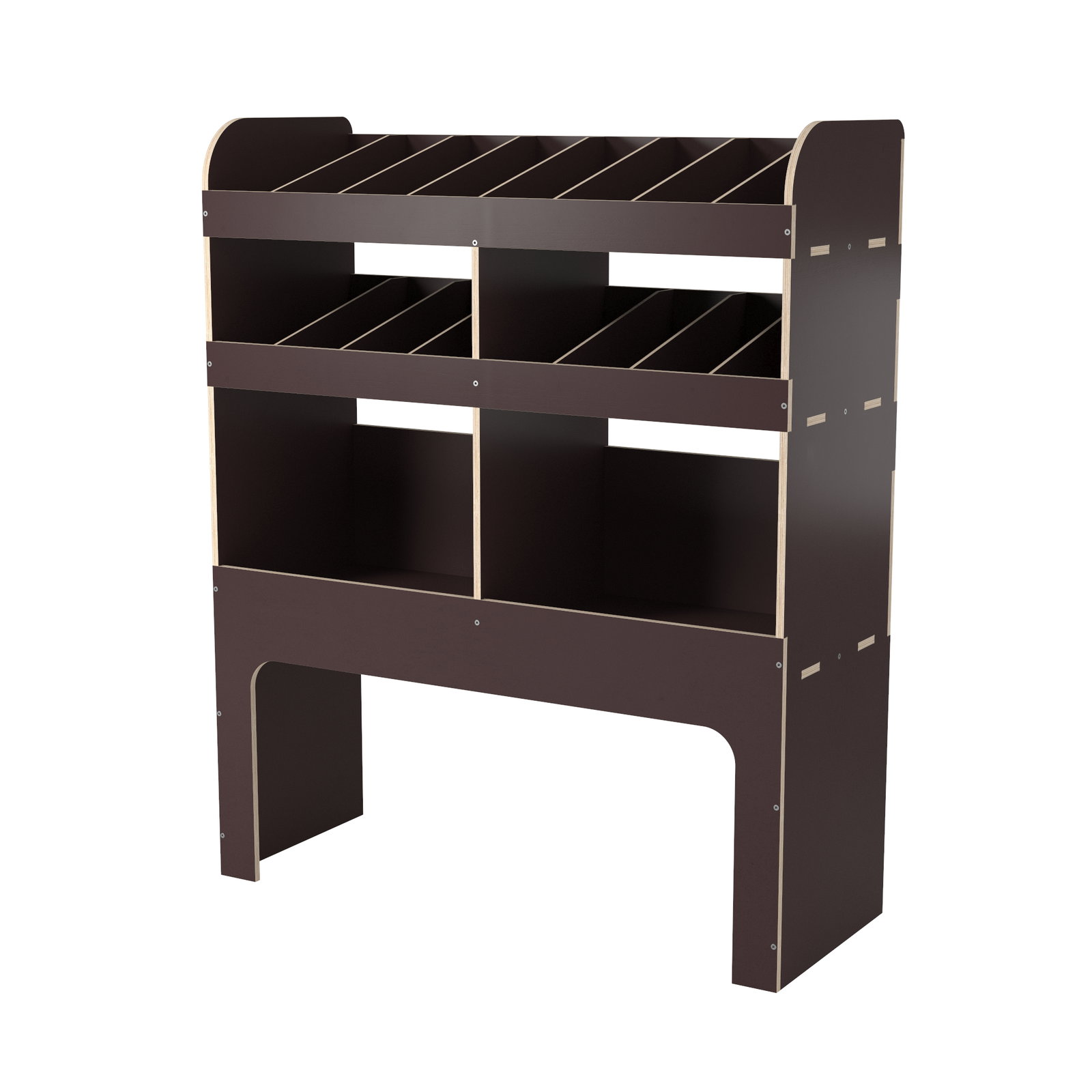 Konstrukcja regału jest wykonana ze sklejki o grubości 12 mm. Dzięki swojej strukturze i wysokiej jakości wykończeniu, półki są wodoodporne oraz maksymalnie sztywne i stabilne wymiarowo. Dzięki temu są one łatwe do czyszczenia i odporne na uderzenia.