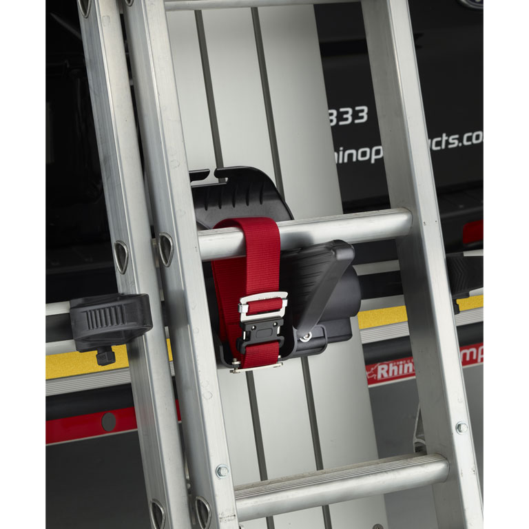Rhino dołącza do zestawu szereg akcesoriów zapewniających solidne przymocowanie drabiny do bagażnika, w tym dwa solidne pasy mocujące drabinę specjalnie do twojegoRenault Trafic. Pasy te są również zabezpieczone specjalnym zapobiegającym ich poluzowaniu. System posiada również przednie i tylne gumowe ochraniacze, które utrzymują stojak na drabinę na miejscu. Ponadto do stojaka na drabinę dołączone są cztery ograniczniki ładunku, dzięki czemu drabiny o różnych szerokościach mogą być przytrzymane w miejscu. Do wariantu, który można zastosować przy jednej standardowej drabinie prostej, dołączony jest jeden zacisk drabinowy, a do wariantu, który można zastosować przy dwóch standardowych drabinach prostych, dołączone są dwa.