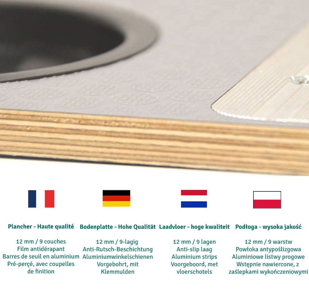 - Podłoga: o grubości 12 mm / 9-warstwowa sklejka brzozowa, wykończona szarą folią antypoślizgową.