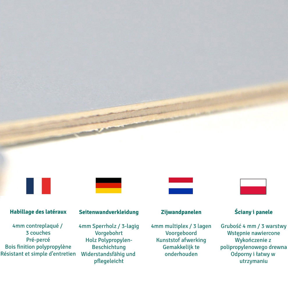 - Panele ścienne i drzwiowe: 4 mm / sklejka 3-warstwowa z powłoką polipropylenową.